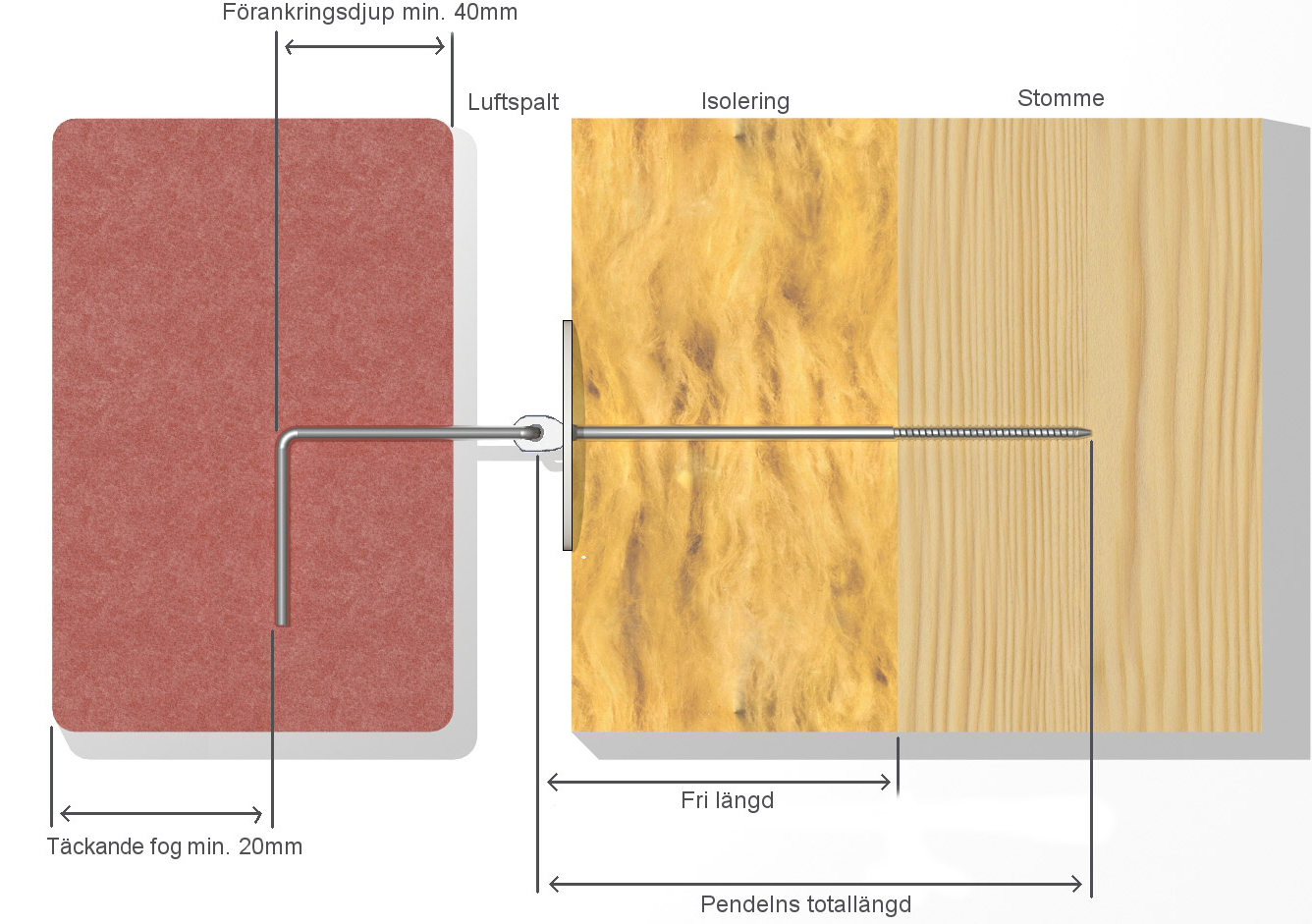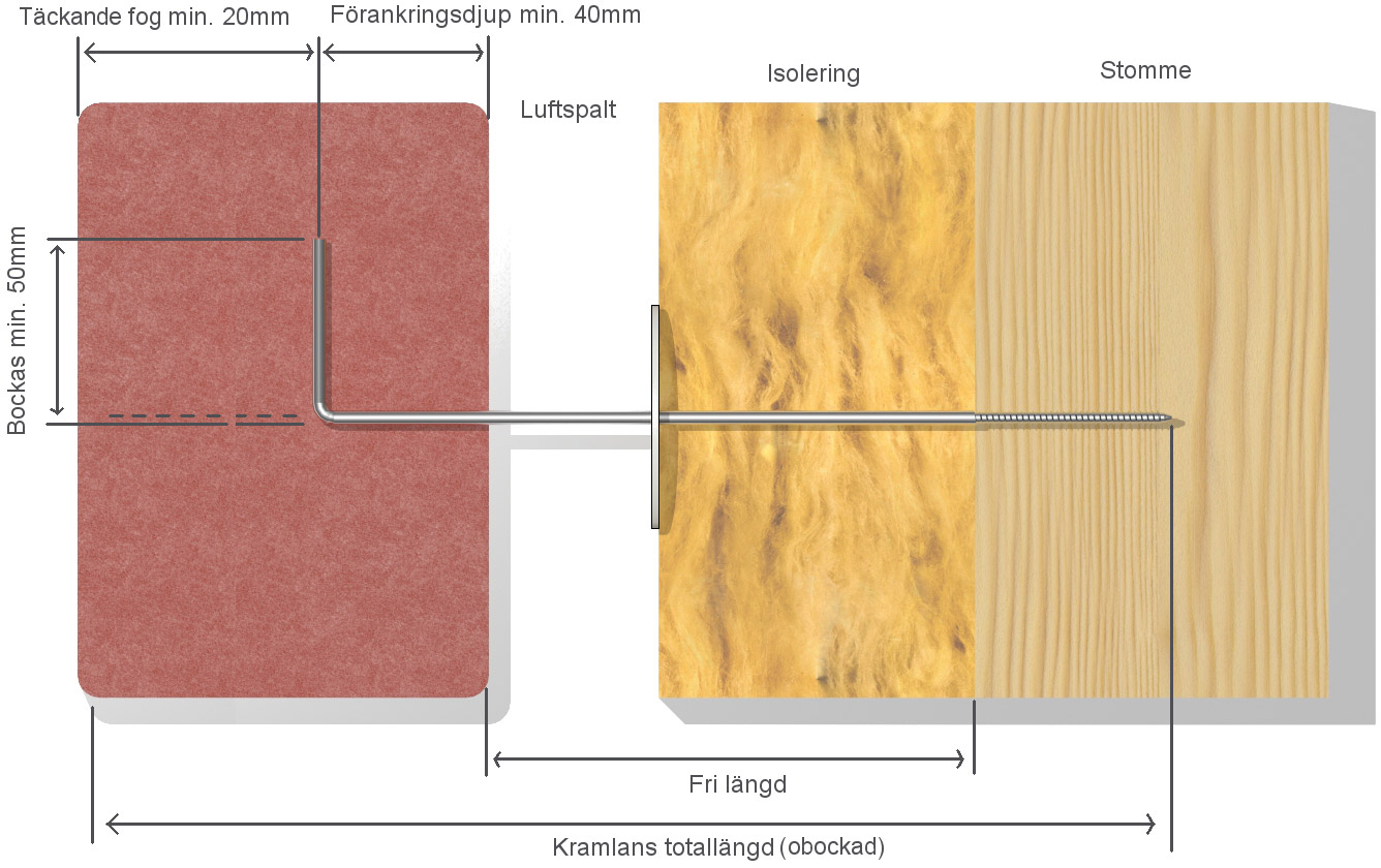 En fast inspänd kramlas längd bestäms av: den fria längden (isolering & luftspalt) och infästningsdjup i bakomliggande väggstomme respektive skalmur, se figur 3.1.1.