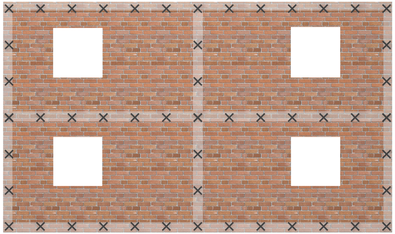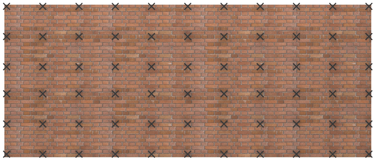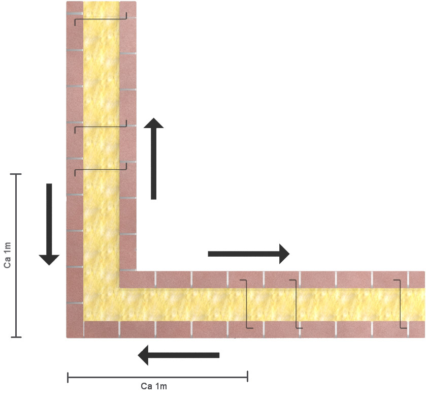 Vid ihopmurade och/eller armerade hörn ska inte kramlor placeras närmare vägghörn än 1.0 m enligt EKS 11, avd. H, detta för att inte inverka ogynnsamt på murverkets förmåga att klara temperatur- och fuktrörelser på den anslutande väggsidan. Antalet kramlor ökas med 50 % på strimlan närmast det kramlingsfria hörnet. Se figur 3.2.4.