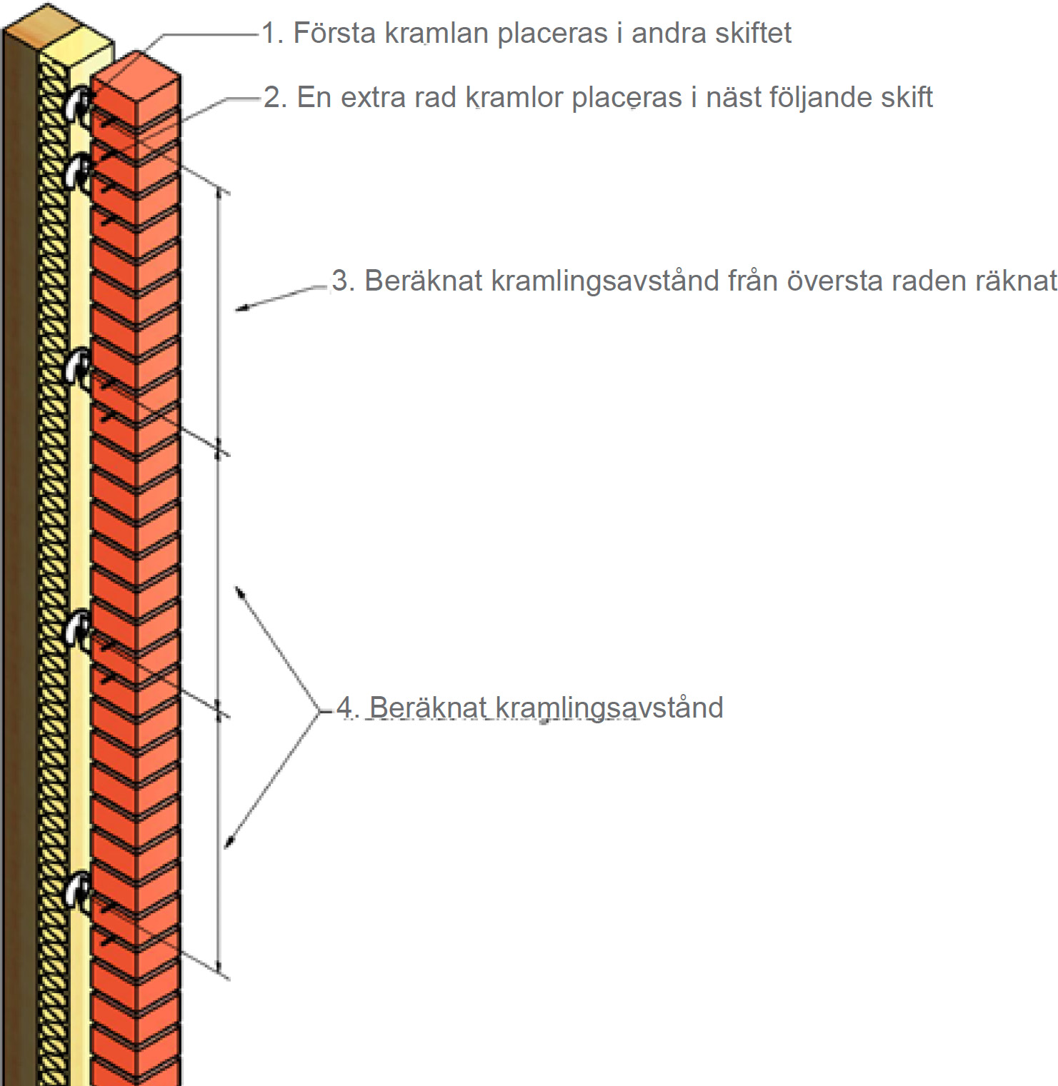 Figur 3.2.1 - Placering av ledad kramla i skalmur där murfästet är färdigbockat.